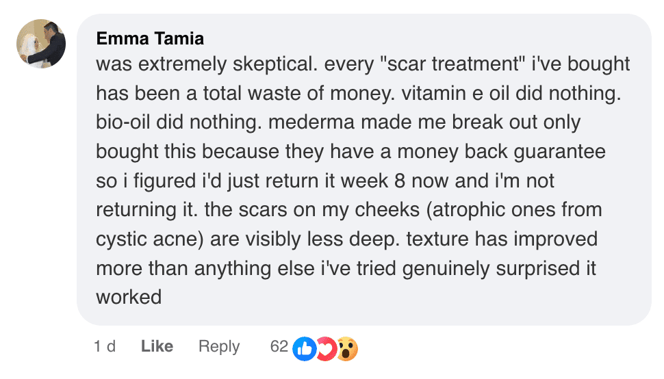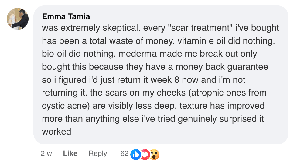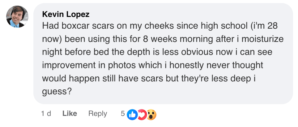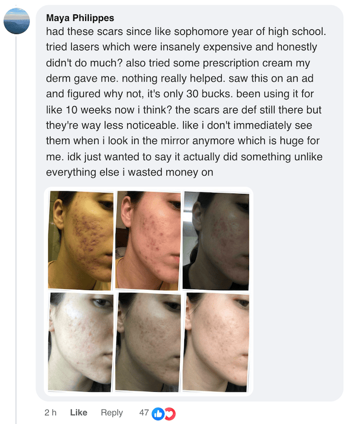Been dealing with acne scars since sophomore year. My mom kept bugging me to try this. Finally gave in and it had really helped me overcome scars